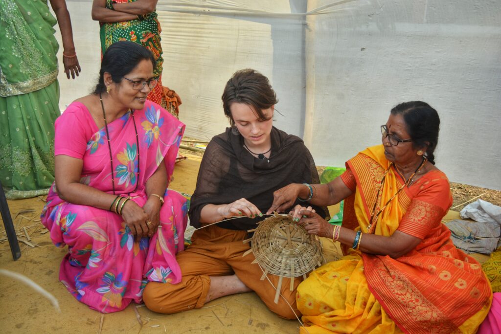 A foreign woman learns basketry techniques from local artists at Gholwad village